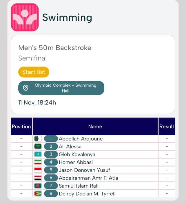 Delroy Tyrrell has proudly carved his name into Guyana’s sporting legacy with a milestone performance at the Islamic Solidarity Games in Riyadh, Saudi Arabia. Competing against a field of elite athletes from across the Islamic world, Delroy rose to the challenge and delivered a historic result, becoming only the third Guyanese swimmer to qualify for the semifinals in an individual event at this prestigious competition.